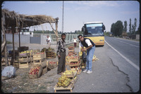 Tourist buys apples from a roadside vendor
