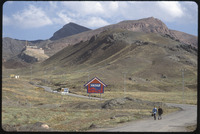 View of landscape and red house-shaped sign ,with Ishak Pasha Palace is distance