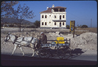 Man driving horse-drawn cart in front of new home