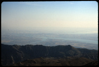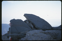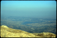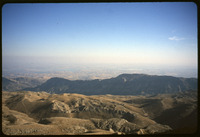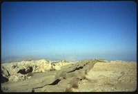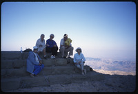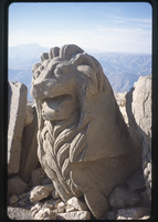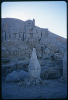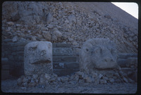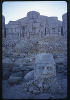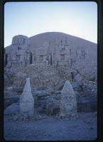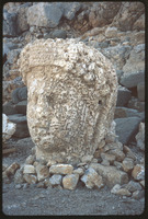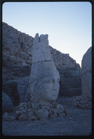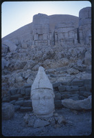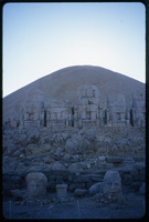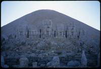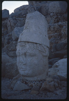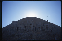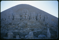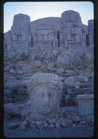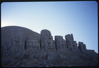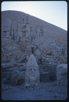 Sculpture of head in front of sitting statues on Mount Nemrut