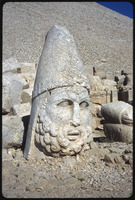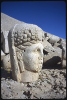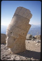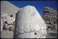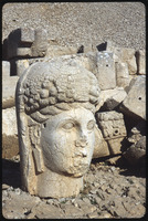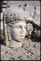 Sculpture of human head with stele reliefs in background