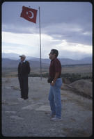 Unidentified men in front of Turkish flag