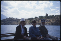 Unidentified people on boat with Church of the Holy Cross in background