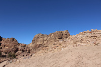 Jordan. Petra, Temple of the Winged Lions, pathway, Qasr al Bint in far right background, visitors