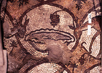Mosaic depicting a fishhead on a plate - North Aisle