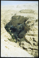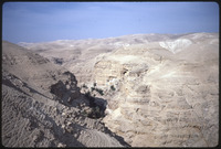 Greek Orthodox St. George monastery, Mt. Of Temptation in background; Roman aqueduct lower right side of wadi