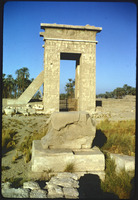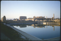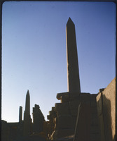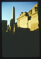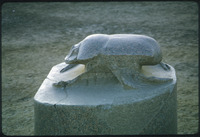 Red granite statue of scarab god on top of pillar near Sacred Lake