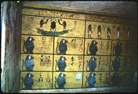 Painting of gods with scarab and crocodile in boat in Seti I tomb