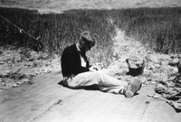 Jordan. Tell er-Rumeith, Paul Lapp examining pottery