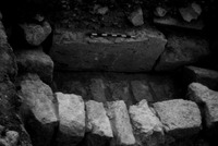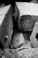 Jordan. Iraq al-Amir, square II.3, looking east at closeup of peg-hole channel at west end of square