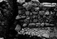 Jordan. Iraq al-Amir, square I.1, looking east at east wall of room with plaster just below wall. Bedrock in channel leading into bir