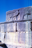 Jordan. Iraq al-Amir, three upper courses and lion frieze at northeast end of Qasr al-Abd