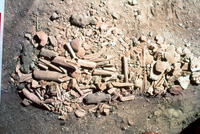 Jordan. Bab edh-Dhra‘, Cemetery G, Tomb G2. Three figurines in situ in bone pile