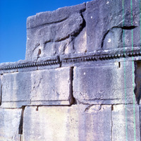 Jordan. Iraq al-Amir, three upper courses and lion frieze at northeast end of Qasr al-Abd