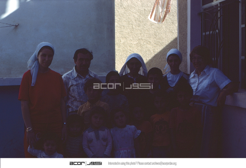 Jordan. Zarqa, Friend of Nancy Lapp visiting the Adawi family at home. Top row, from left: Mufida Salim, Mohammed "Abu Ahmed" (father of ACOR Facilitator Saeed and Facility Manager Abed), Jalila Salim, Kawthar Abd Al Hameed (mother of Saeed and Abed), Nan