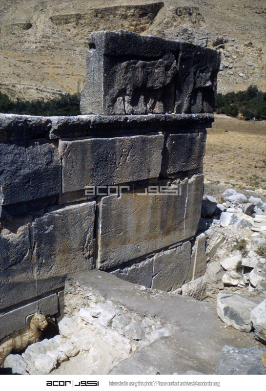 Jordan. Iraq al-Amir, feline fountain behind Byzantine wall of Qasr Al-Abd (bottom left), wall frieze (top right)