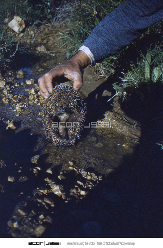 Jordan. Iraq al-Amir, workman holding hedgehog