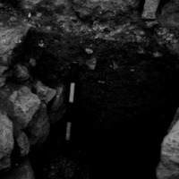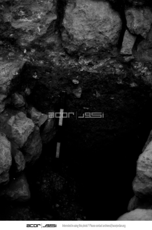 Jordan. Iraq al-Amir, square I.1, looking east at east wall of room with plaster just below wall. Bedrock in channel leading into bir
