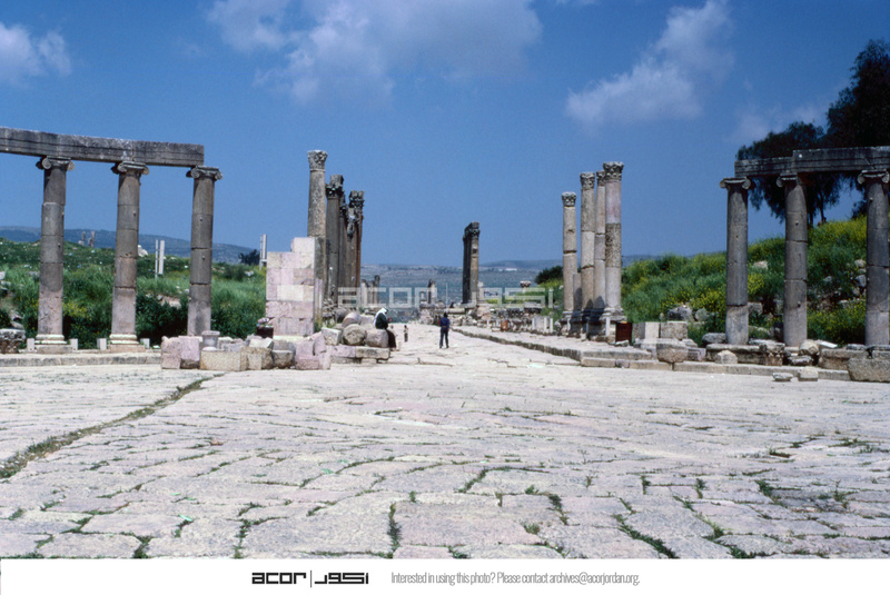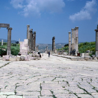 Jordan. Jerash, looking north at Forum and down colonnaded street (Cardo maximus)