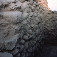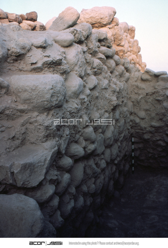 Jordan. Bab edh-Dhra‘ town site, Field IV.4, looking west at section cut through early Bronze Age III town wall. South face of gateway with remnants of wooden beam throughout seven meters of wall face