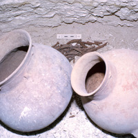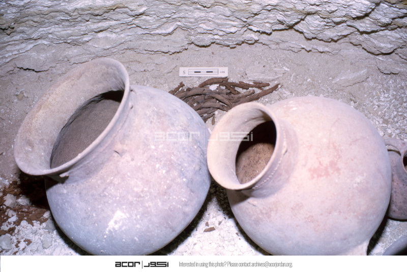 Jordan. Bab edh-Dhra', Cemetery A, Tomb A76E. Closeup of pots in front of basket fragments