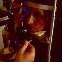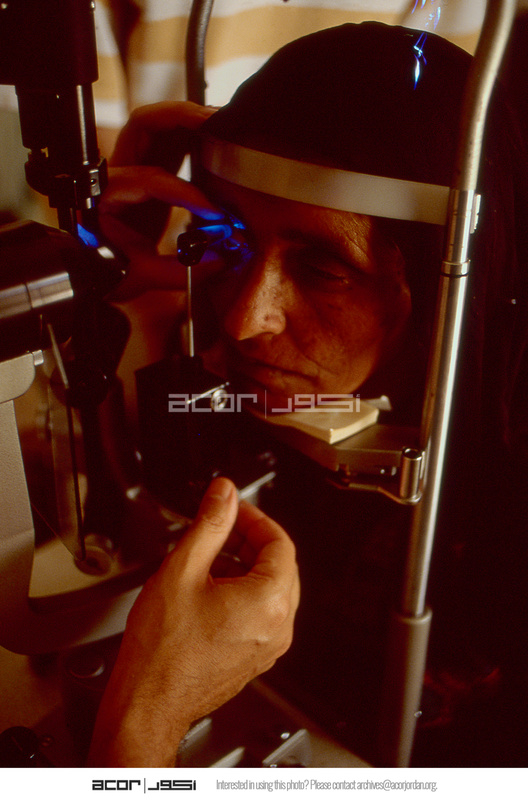 Palestine. West Bank, Dr Roman de Cock examines patient on St John Ophthalmic Hospital Outreach visit to Auja refugee camp