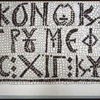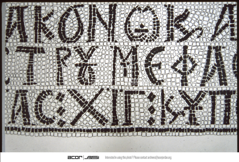 Umm al-Rasas - Detail of Greek inscription in mosaic in Church of St. Stephen