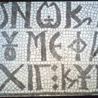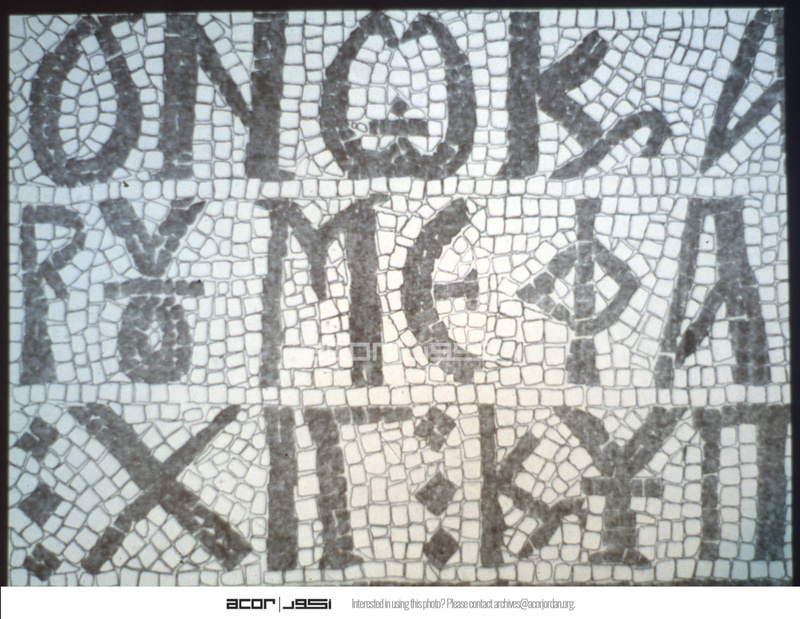 Umm al-Rasas - Detail of Greek inscription in mosaic in Church of St. Stephen