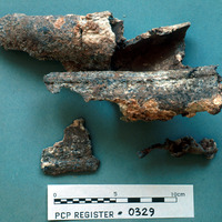 Fragment of lead pipe, distorted from original shape; lead - Sq. F2. Loc. 22
