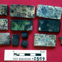 12 rectangular cubes (inlay for archival box?); glass - Sq. I. Loc. 12