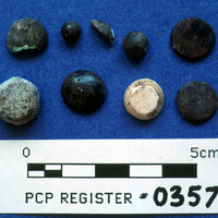 Eight flattened hemispheres of glass (inlay for archival box?); glass - Sq. I. Loc. 12