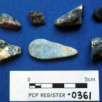 Six pieces of teardrop-shaped glass (inlay for archival box?); glass - Sq. I. Loc. 12