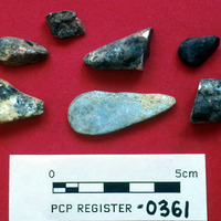 Six pieces of teardrop-shaped glass (inlay for archival box?); glass - Sq. I. Loc. 12