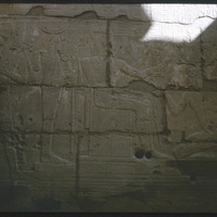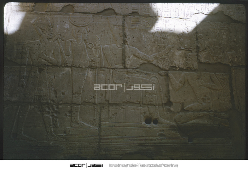 Detail of relief depictingSeti I on left kneeling before Ramasses II before Amon with Khonsis behind in Seti I Temple