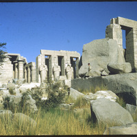 Ramessuem looking west towards temple; Mac on colossal, Nancy in 2nd court