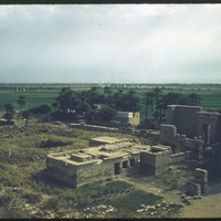 View from Medinat Habu over agricultural land and rural village with the Colossi in the distance