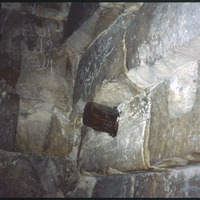 Mydum: corbelled roof in chamber, showing original and new scaffolding