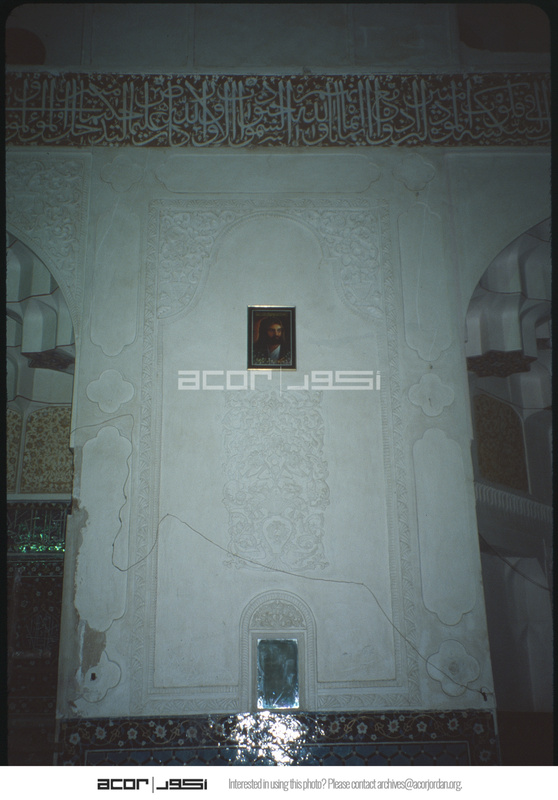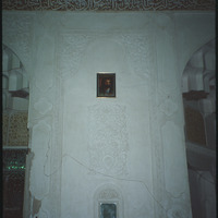 View of painting on wall with stucco reliefs and Arabic inscriptions