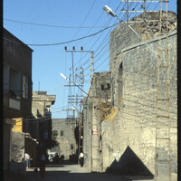 View down street with city wall
