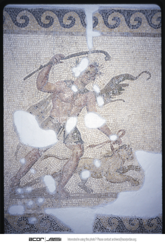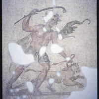 Detail of mosaic depicting satyr with lion on a leash in the Antakya Museum