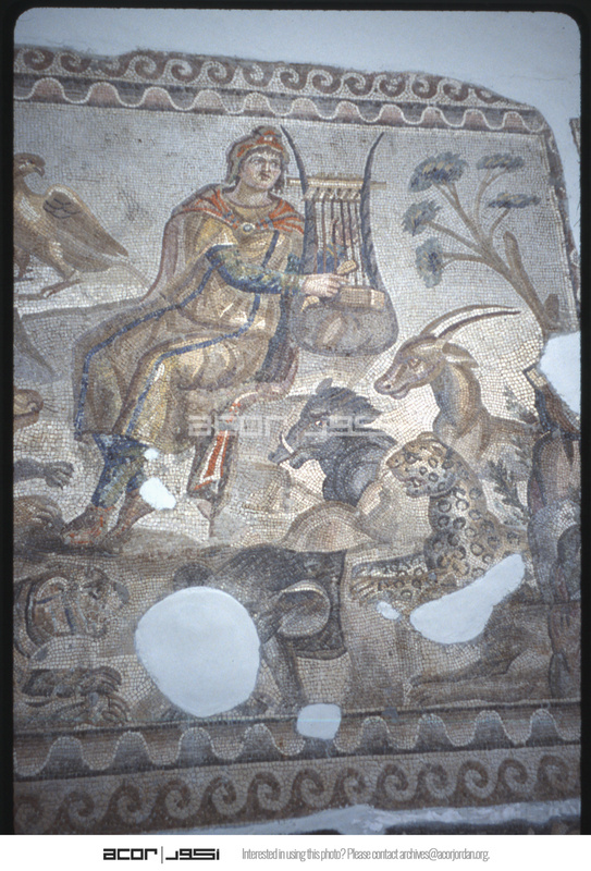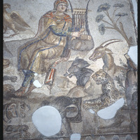 Detail of mosaic depicting Orpheus playing a cithara surrounded by animals in the Antakya Museum