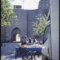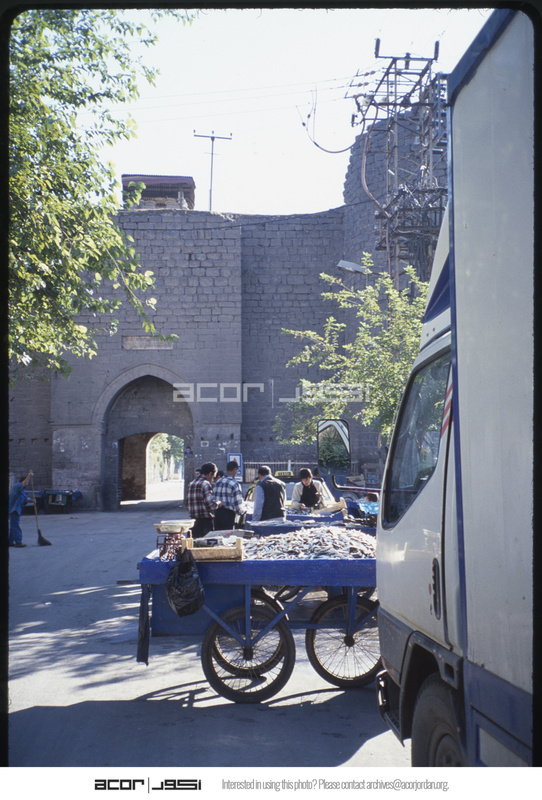 Fish vendor carts in front of gate in city wall