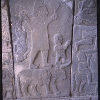 Detail of Hittite relief depicting man and child atop a bull