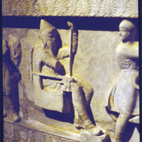 Detail of relief on Lycian sarcophagus of Sidon depicting ruler on throne