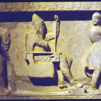 Detail of relief on Lycian sarcophagus of Sidon depicting ruler on throne