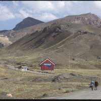View of landscape and red house-shaped sign ,with Ishak Pasha Palace is distance