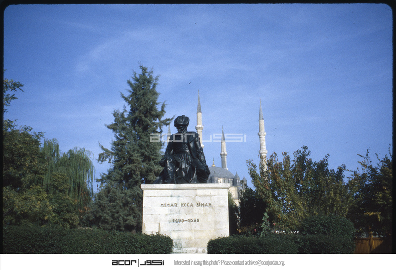 Statue of the architect Sinan with minarets of Selimiye Mosque