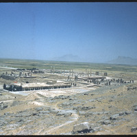 From SE: left Temples of Xerxes, then Darius, Ataxerxes, Apadana, museum, court; right treasury, 100 column hall, hazy background where black stone from