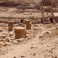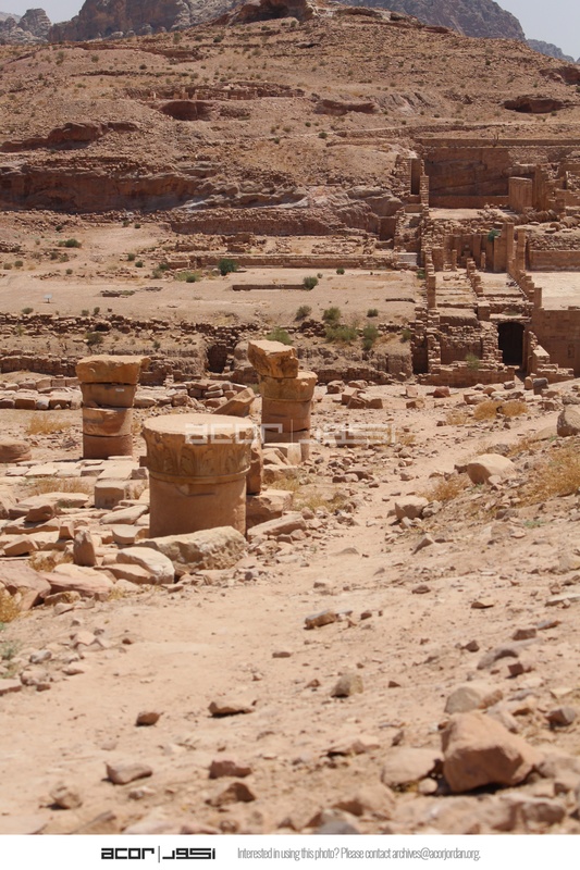 - Jordan. Petra, Temple of the Winged Lions, lapidarium, pathway, Great Temple in background