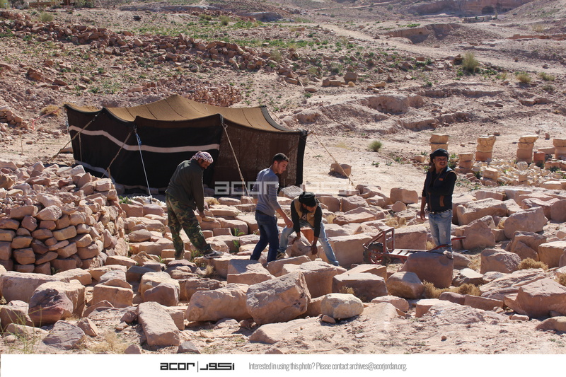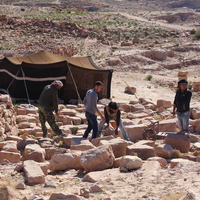 Jordan. Petra, Temple of the Winged Lions, team members, bedouin tent